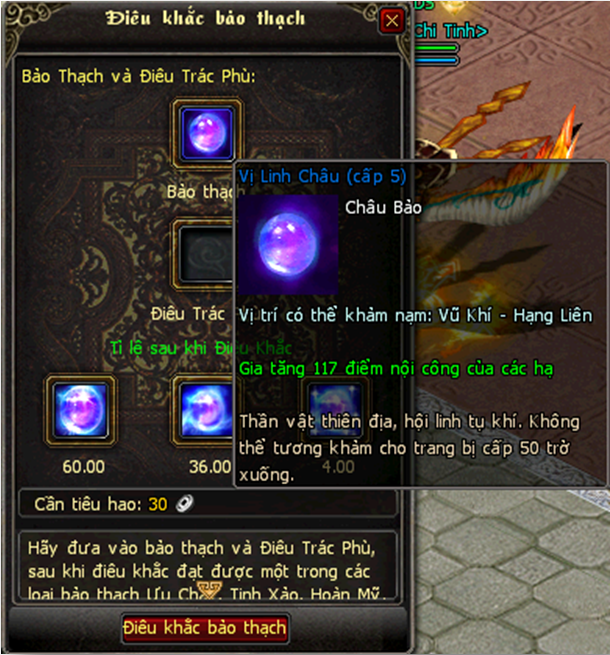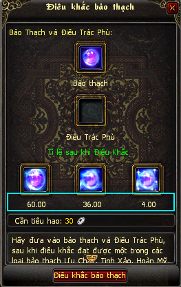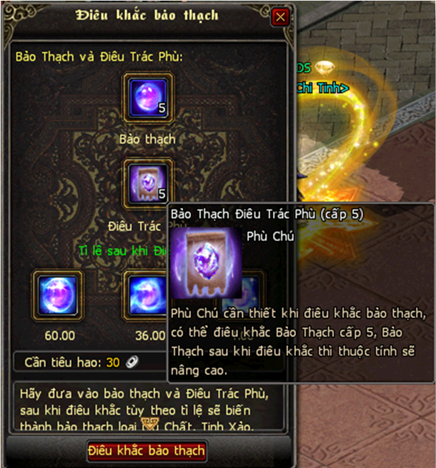 Bước 4: | Để quá trình điêu khắc diễn ra thành công, cần sử dụng đúng loại Bảo Thạch và Điêu Trác Phù, tương ứng với cấp độ của Bảo Thạch. Lưu ý: Tính năng có xác suất % ngẫu nhiên điêu khắc ra 3 loại Bảo Thạch khác nhau.