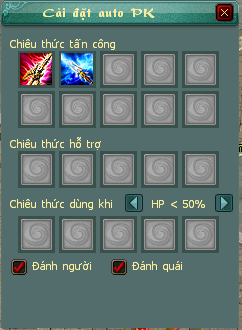 - Bản thân còn % sinh mệnh: Sẽ tự động sử dụng kỹ năng ở đây khi sinh mệnh dưới % thiết lập