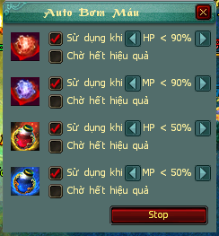 Hãy thiết lập vật phẩm và bấm start. Vì auto train không thể sử dụng cùng auto PK nên hãy thiết lập auto bơm máu khi PK