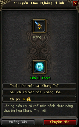 Bước 3: | Có thể đặt Trang Bị và Tinh Di Thạch như hình sau để tiến hành Chuyển Hóa Kháng Tính. Quá trình sẽ tiêu hao tiền vàng cố định của các bạn. | ![]() |